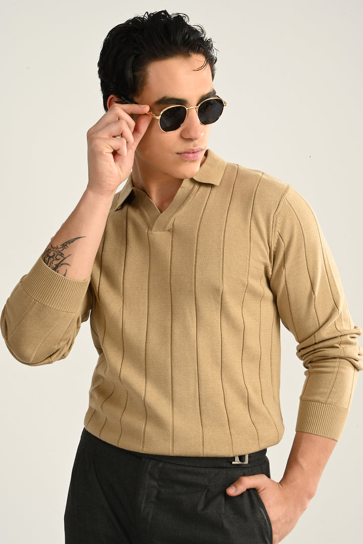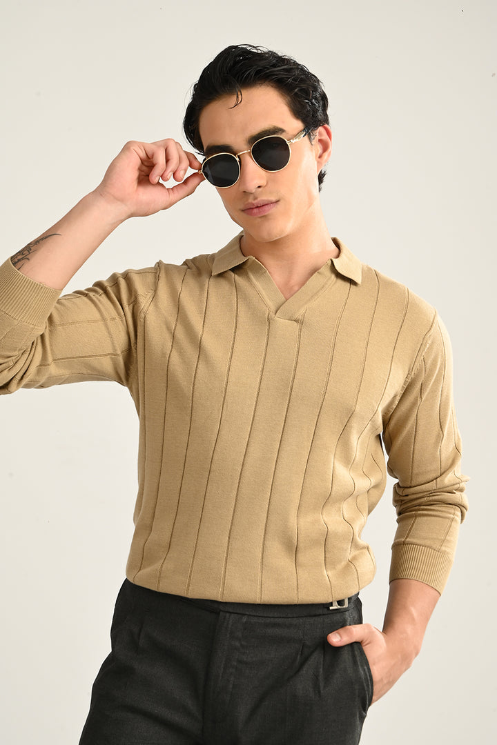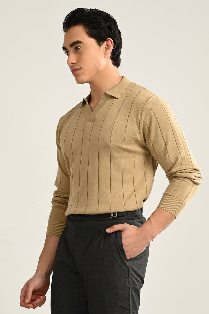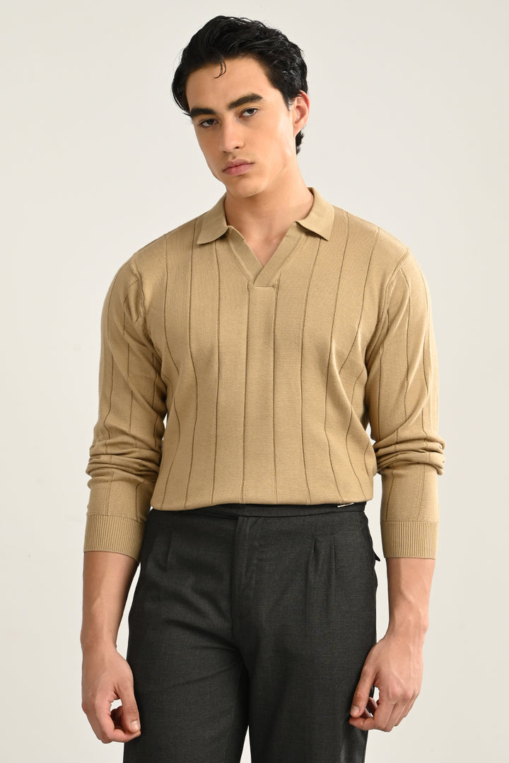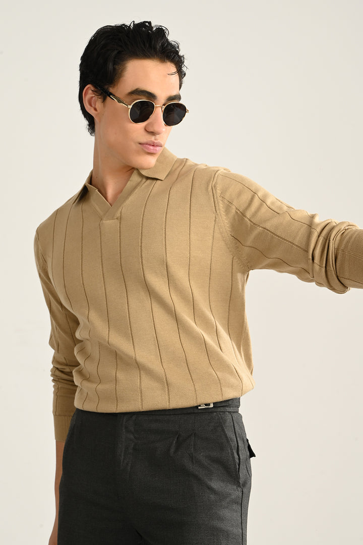 Upgrade your casual wardrobe with ILYZLY Beige Self Design Polo T-Shirt Full Sleeve where comfort meets timeless style. Made with soft knit fabric, this versatile piece is perfect for warmer days while maintaining a polished look. Whether it's a casual outing or a relaxed day at work, this polo has got you covered.