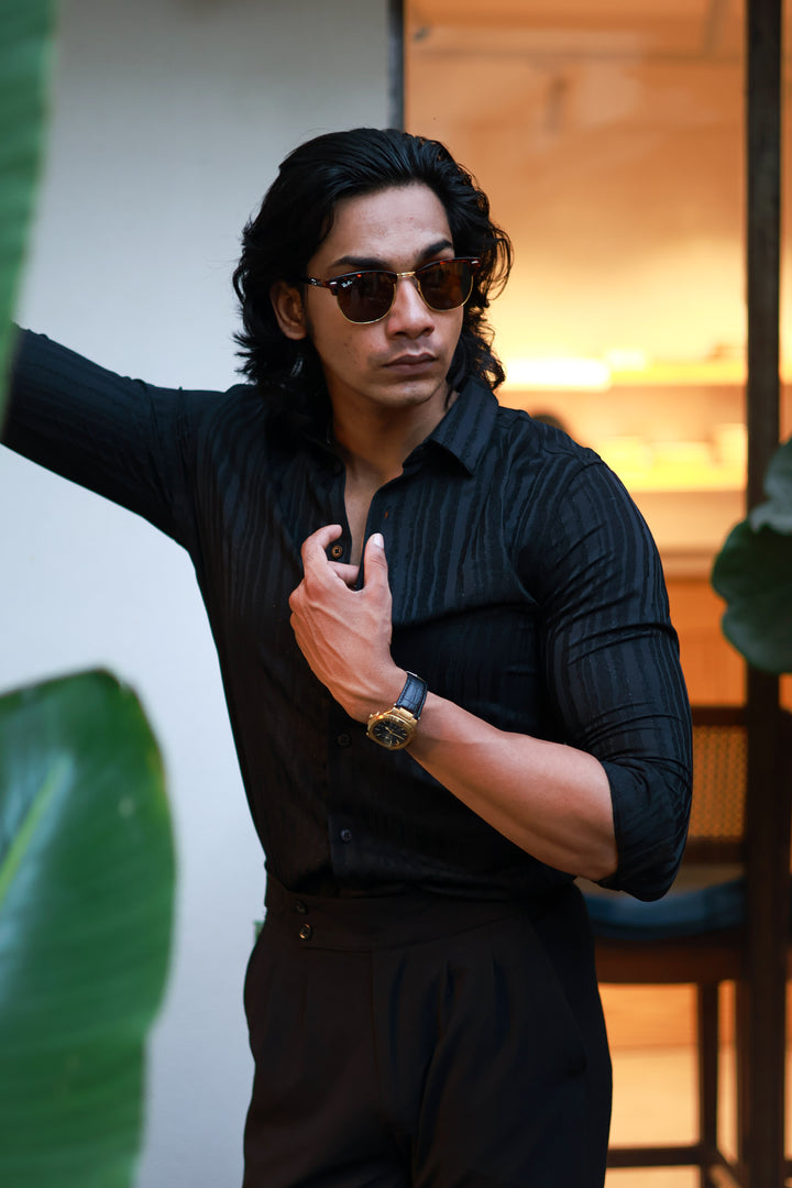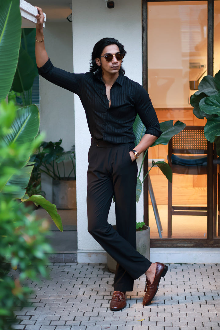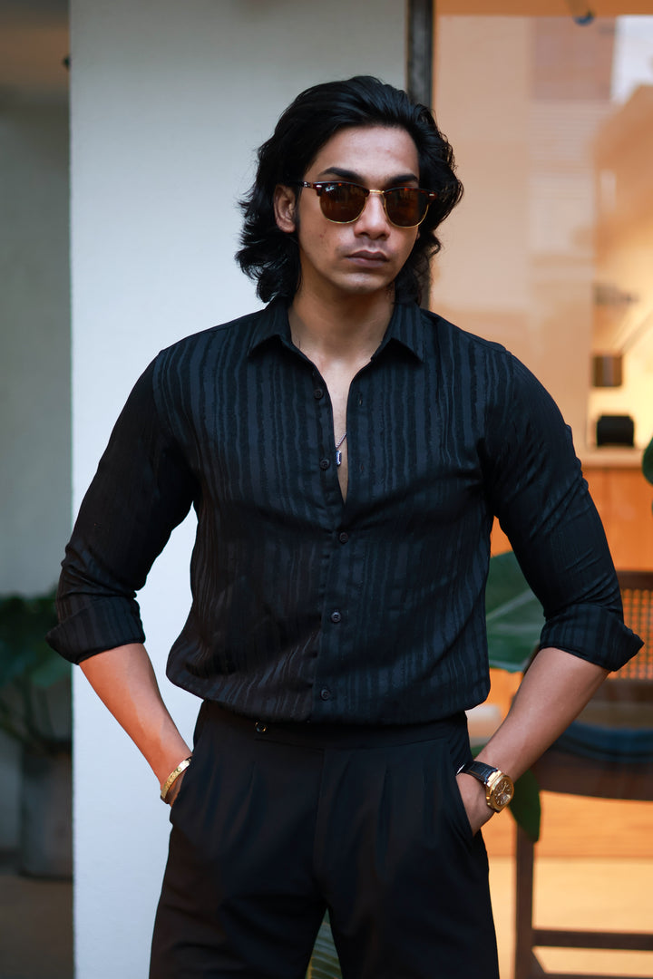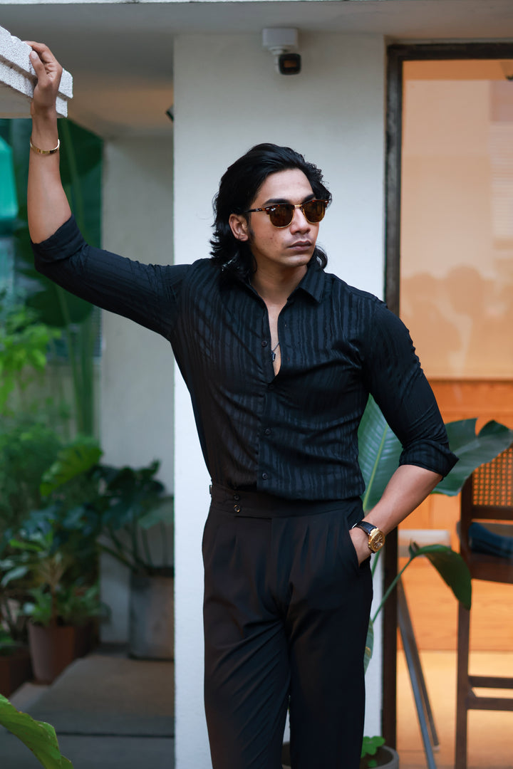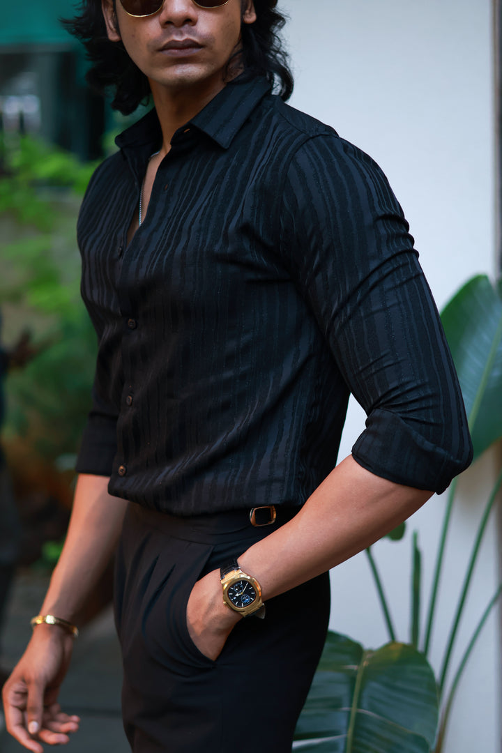 Elevate your style with our ILYZLY Black Vertical Striped Shirt perfect for those smart-casual occasions. Crafted from premium, breathable linen fabric, it offers comfort and a polished look. The lightweight texture makes it ideal for all-day wear, while its semi-formal design seamlessly transitions from the office to after-hours events. A versatile wardrobe essential for the modern man. Comfort: Soft, breathable fabric for all-day wear