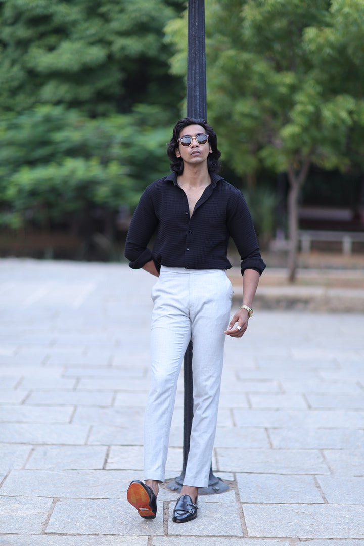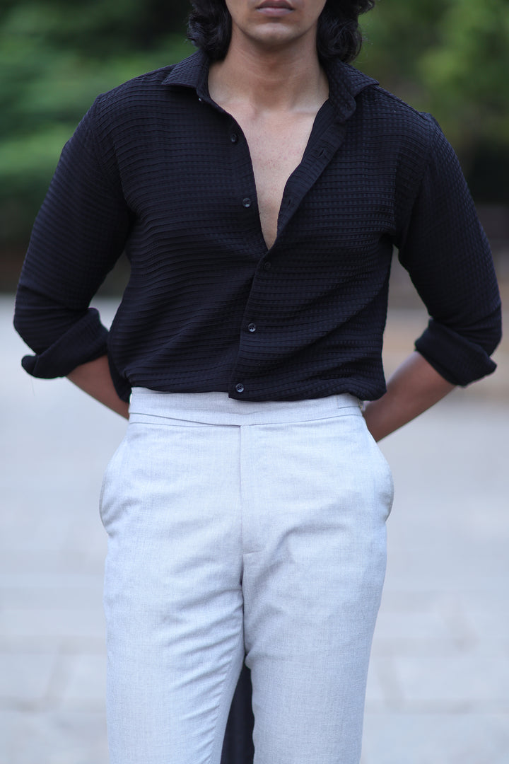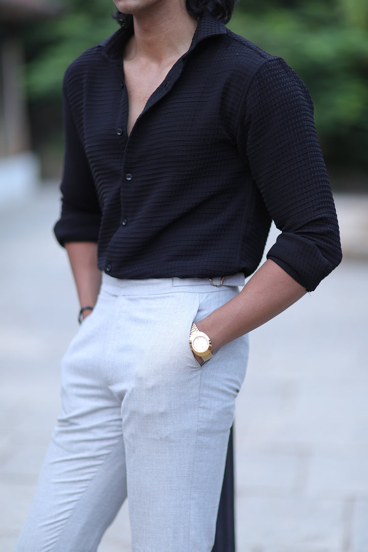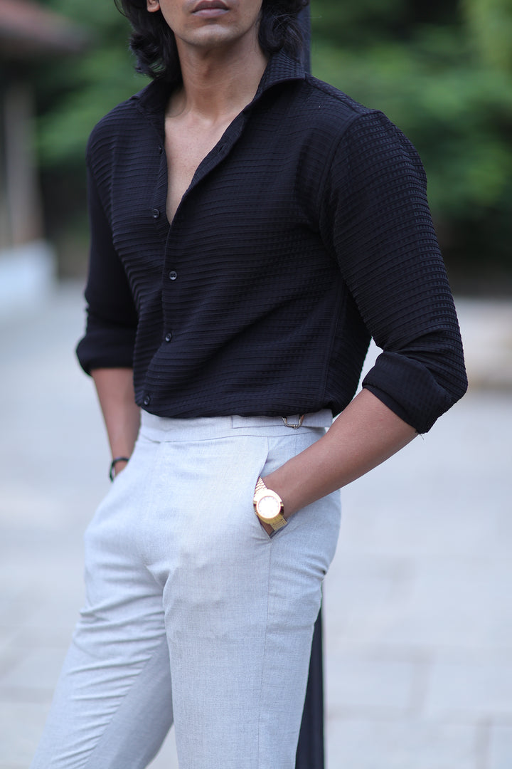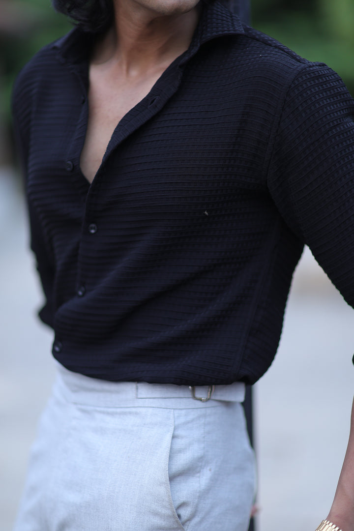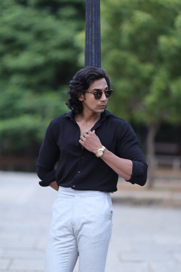 Elevate your style with our ILYZLY Black Waffle Weave Office Wear Shirt perfect for those smart-casual occasions. Crafted from premium, breathable linen fabric, it offers comfort and a polished look. The lightweight texture makes it ideal for all-day wear, while its semi-formal design seamlessly transitions from the office to after-hours events. A versatile wardrobe essential for the modern man. Comfort: Soft, breathable fabric for all-day wear