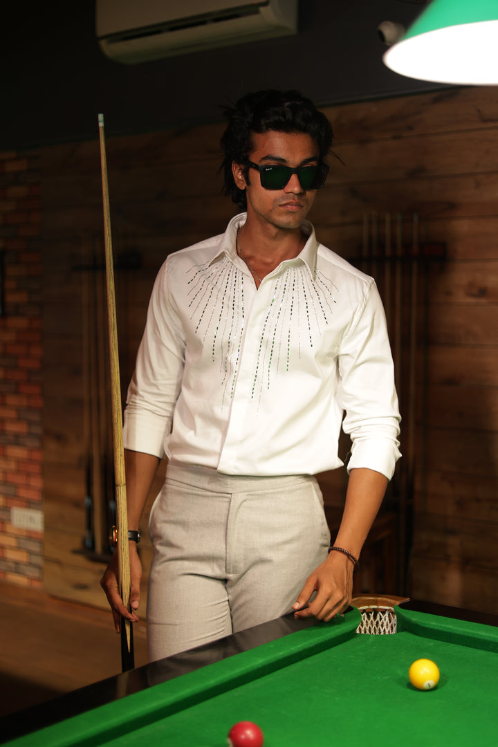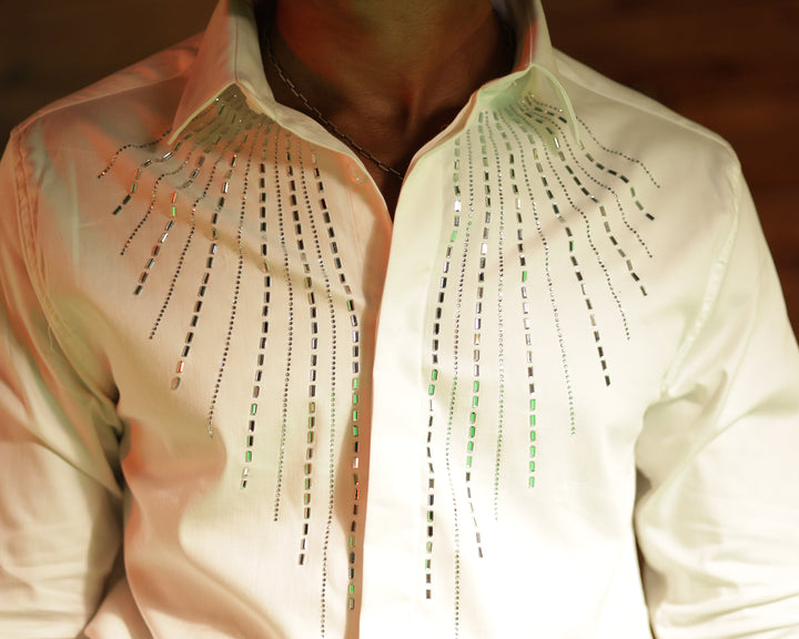 Elevate your style with our ILYZLY White Metallic Studs Designer Wear Shirt perfect for those smart-casual occasions. Crafted from premium, breathable Cotton fabric, it offers comfort and a polished look. The lightweight texture makes it ideal for all-day wear, while its semi-formal design seamlessly transitions from the office to after-hours events. A versatile wardrobe essential for the modern man. Comfort: Soft, breathable fabric for all-day wear